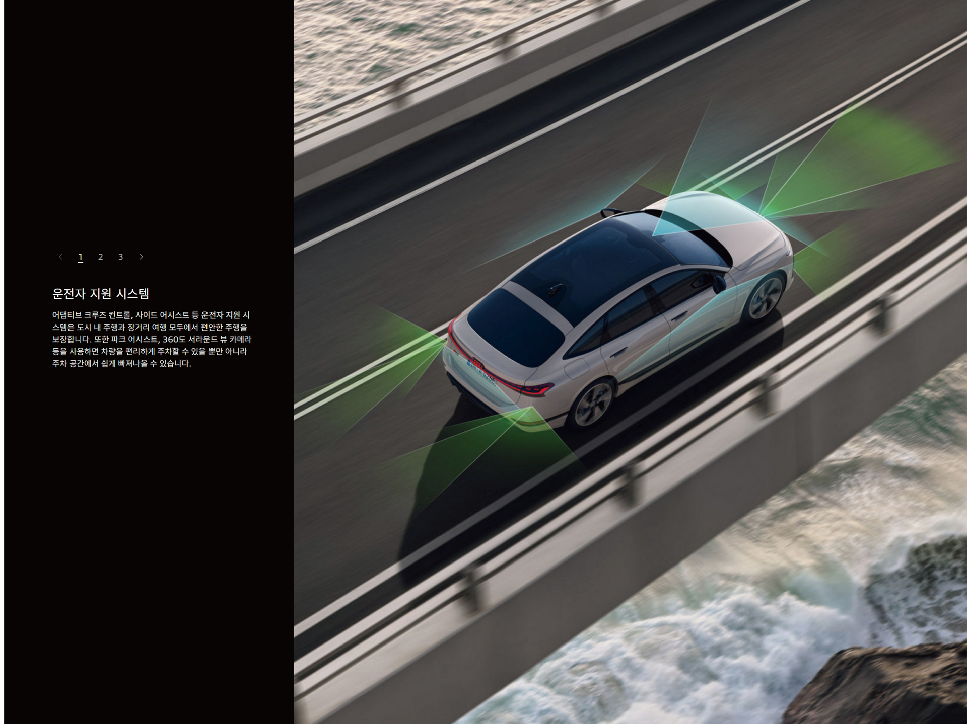 버추얼 사이드 미러: 옵션 사양인 버추얼 사이드 미러의 카메라는 후방 뷰를 고해상도 OLED 디스플레이에 투사하며, 인체공학적 설계 덕분에 운전자의 시야 안에 자연스럽게 표시됩니다. 또한 차량의 공기역학을 개선하며 전동식으로 접을 수 있습니다.